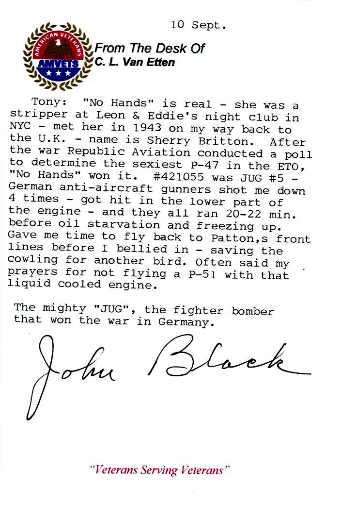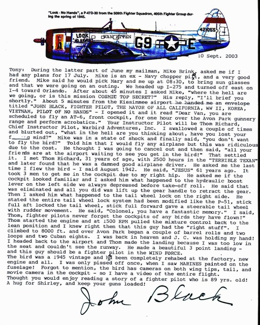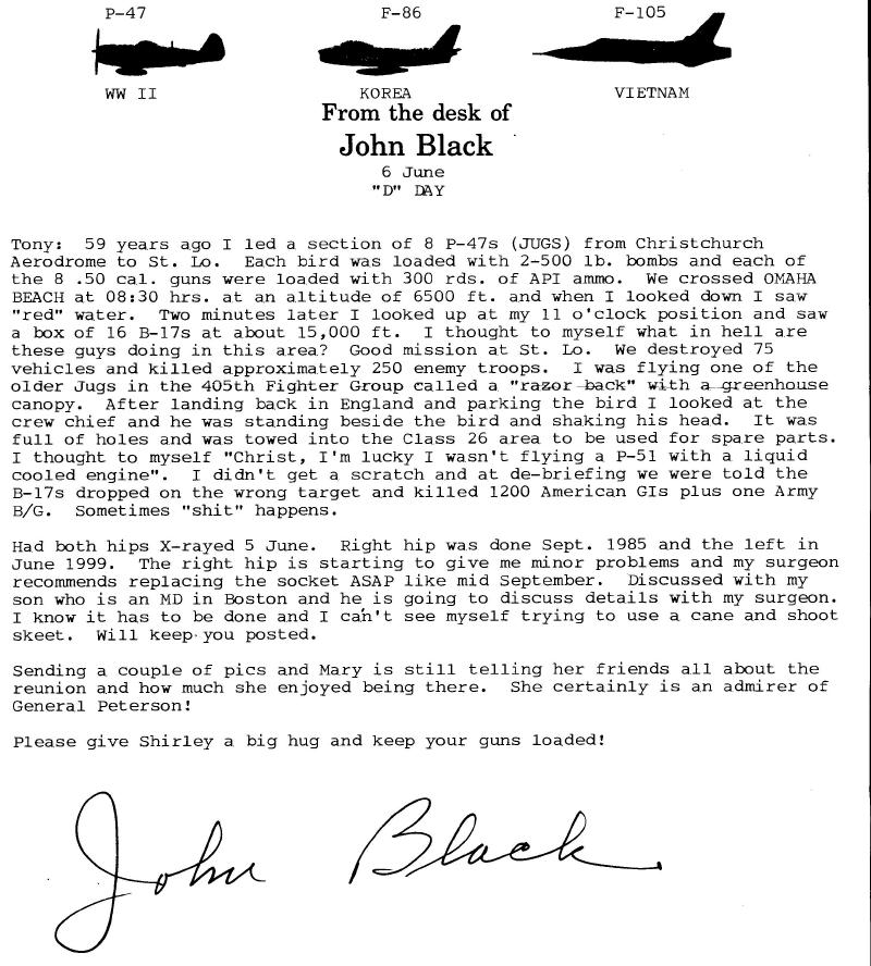 This is John Black's latest writing. It is too large to post on this page, so you will have to click on it for the full size. If I reduce it to where it will fit then you won't be able to read it. Thanks to Tony Gagliano for furnishing us with all the items you see above except the picture at the top with the flag. I took that from a 1957 EAFB Year Book, which I have.