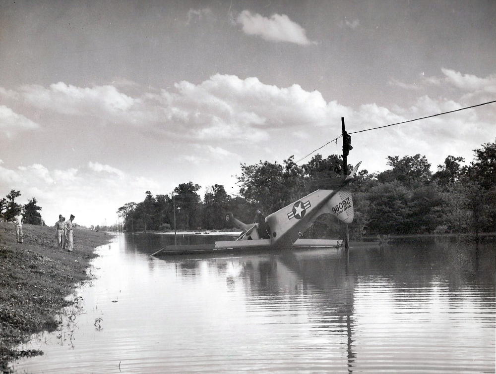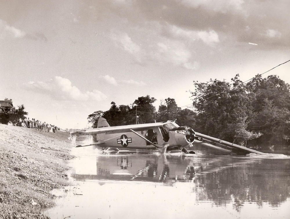 MAY 1953: DURING SEVERE FLOODING, OUR 6TH LIAISON DETACHMENT PERFORMED RESCUE OPERATIONS PICKING UP STRANDED PEOPLE ALONG THE BAYOU LEVEES. PILOTED BY 1/LT. ROBERT L. ENANDER, THIS LANDING DIDN’T WORK OUT TOO WELL. BOB BARELY GOT OUT AND WAS CHARGED WITH PILOT ERROR. I’M STANDING ON THE BANK IN T-SHIRT PREPARING TO WADE IN AND RECOVER THE AIRCRAFT LOG. NICE JOB -FROGS, SNAKES AND ALL.